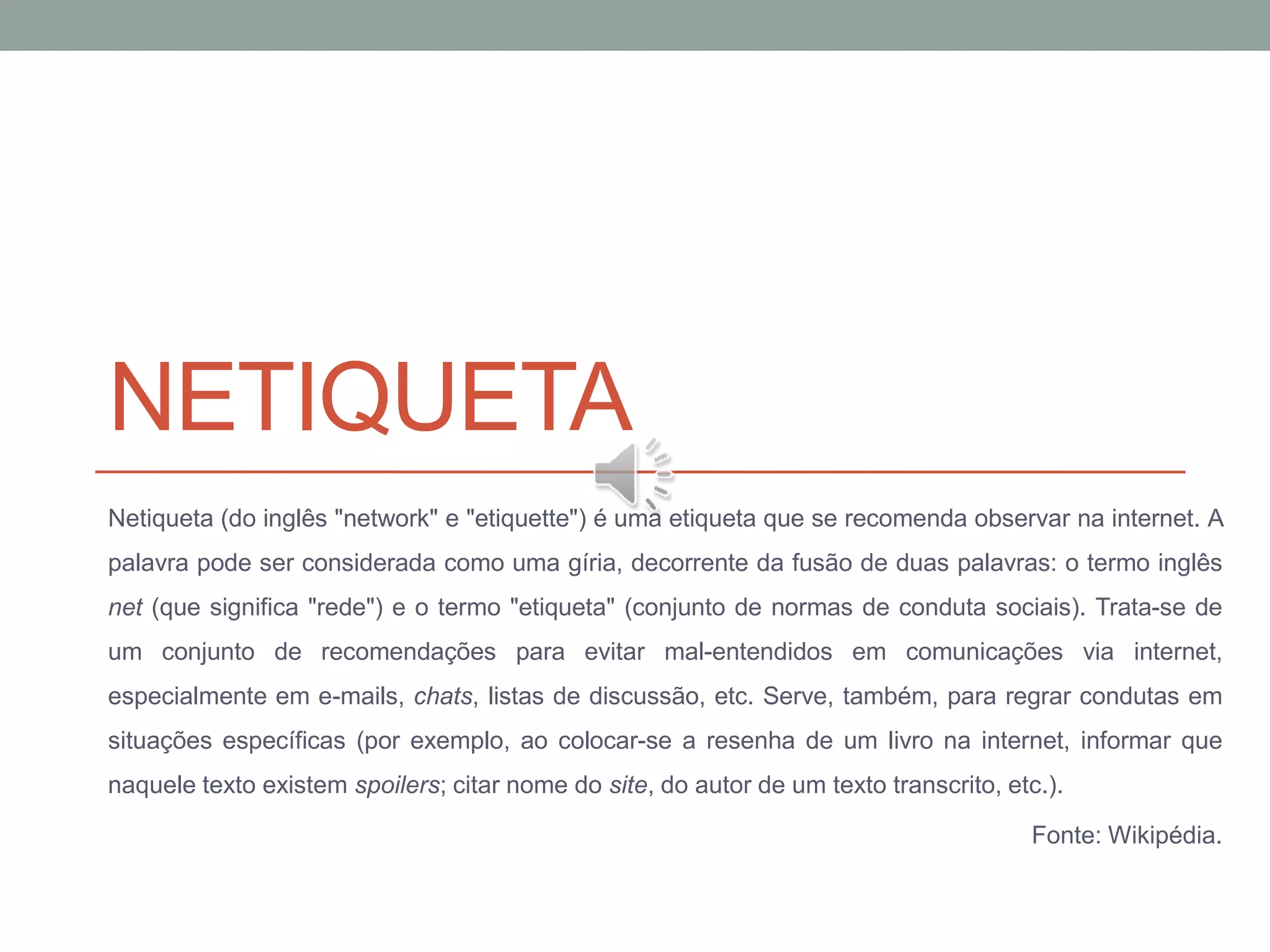 Netiqueta refere-se a um conjunto de recomendações para evitar mal-entendidos em comunicações online, como e-mail e chat. Inclui regras como evitar mensagens em maiúsculas, respeitar os outros, e usar argumentos em vez de palavrões. A netiqueta serve para promover comunicações online respeitosas.