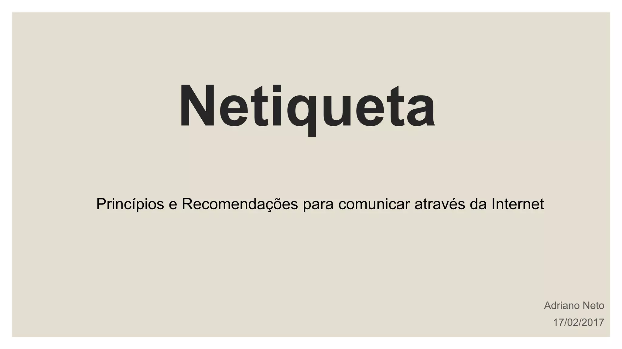 O documento discute os princípios e recomendações da netiqueta para comunicação online. Ele introduz o conceito de netiqueta como o comportamento de um usuário na internet, especialmente na comunicação virtual. Em seguida, lista algumas regras de uso da netiqueta, como ser cuidadoso com o que se fala online, ser claro e breve, prestar atenção aos e-mails e postagens em redes sociais, e respeitar as crenças e evitar comportamentos racistas dos outros.