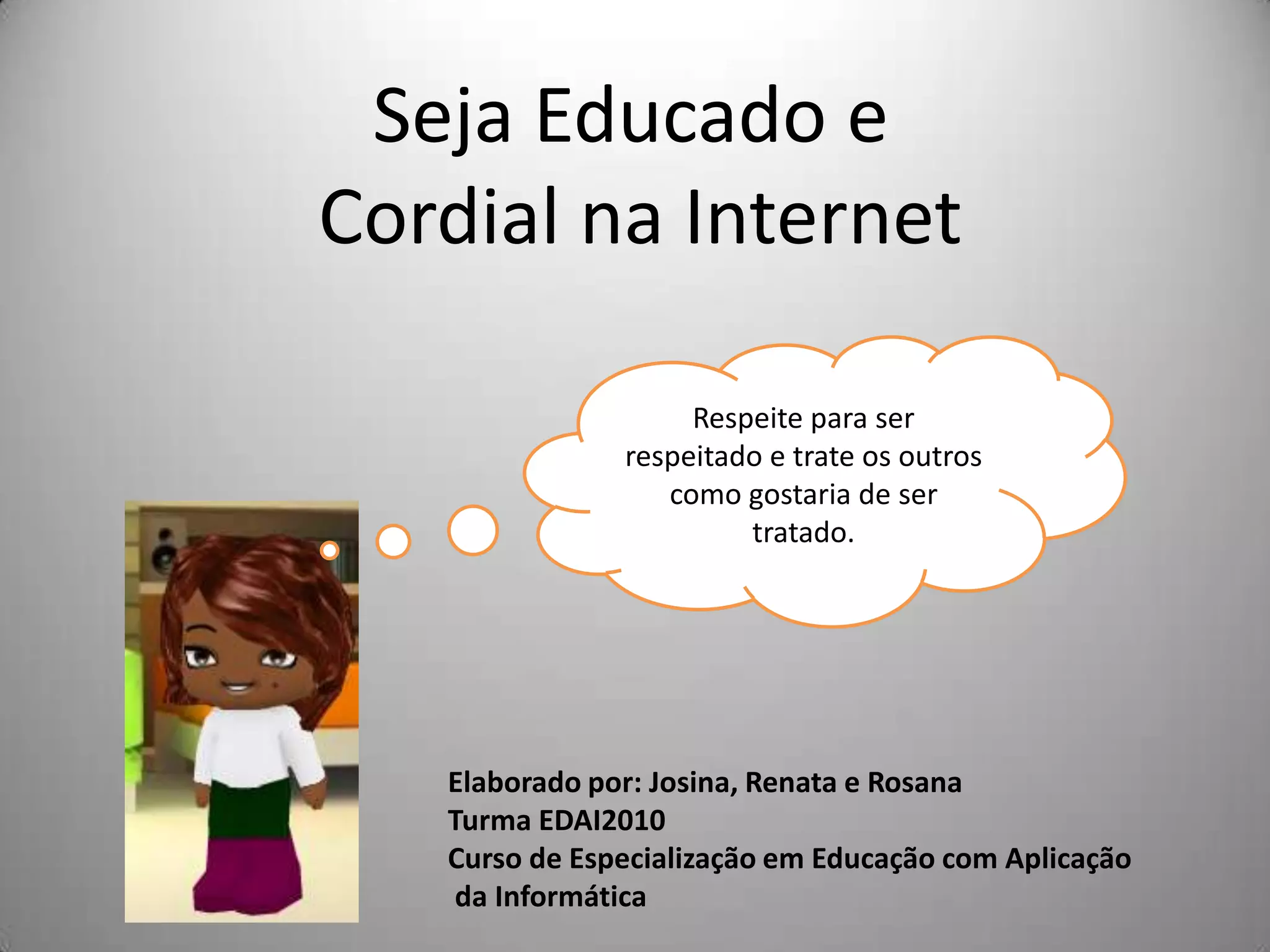 Este documento discute as regras de etiqueta na internet, conhecidas como netiqueta. Ele enfatiza a importância de respeitar os outros, evitar assuntos ofensivos, e ser educado em mensagens instantâneas, fóruns e e-mails. A netiqueta foi criada para que as pessoas sejam respeitosas e evitem conteúdo que possa ofender ou causar desentendimentos.