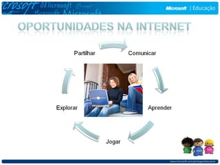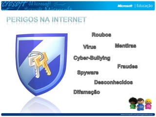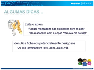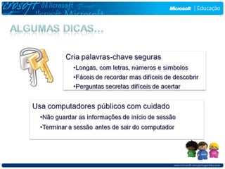 O documento fornece conselhos de segurança para estudantes sobre como se comportarem online, incluindo não divulgar informações pessoais, evitar conversar com estranhos, e avisar um adulto se estiverem sendo vítimas de cyberbullying. Recomenda que os jovens usem as redes sociais com cuidado e verifiquem a validade das informações encontradas online.