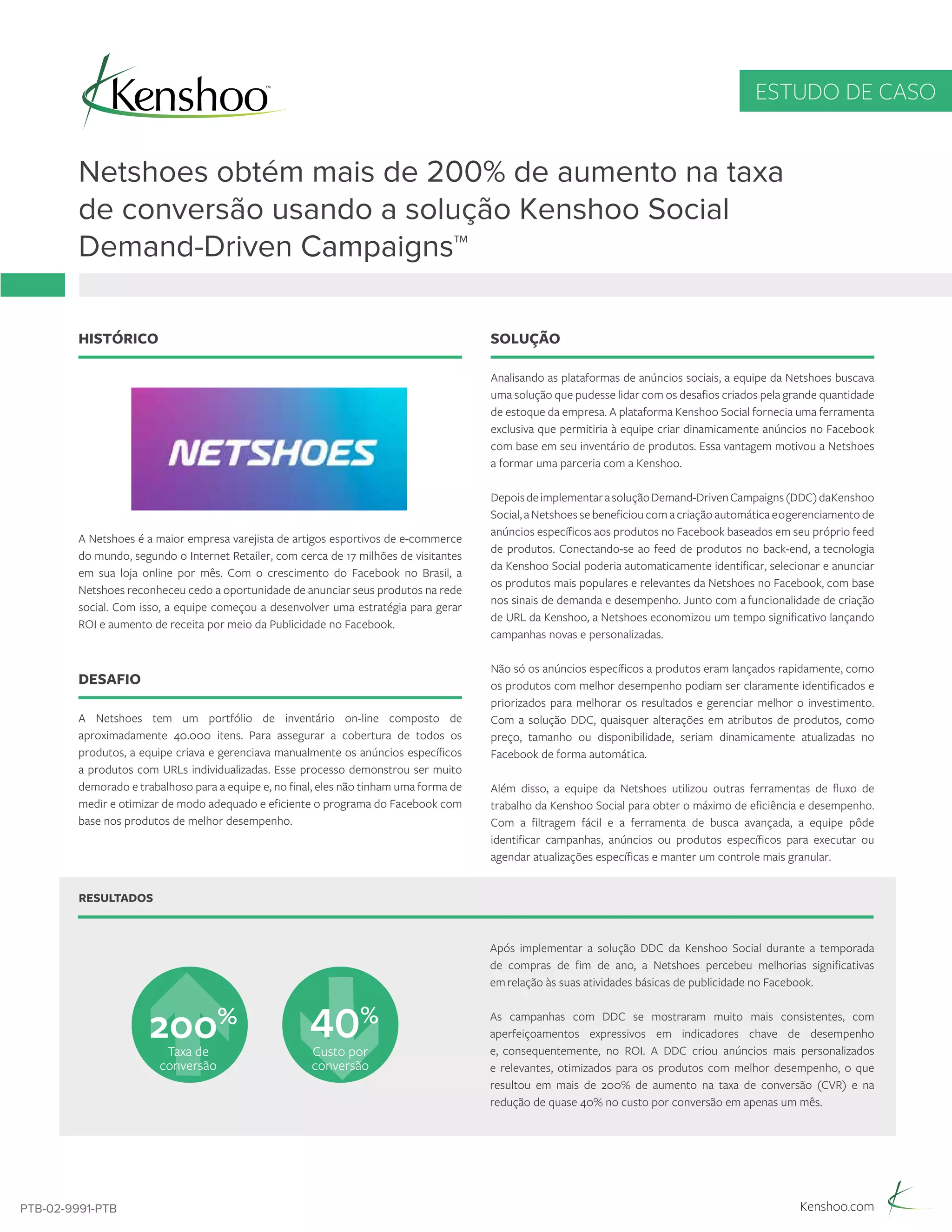 Este documento descreve como a Netshoes, uma varejista de artigos esportivos online, implementou com sucesso a solução Demand-Driven Campaigns da Kenshoo para anúncios dinâmicos no Facebook com base em seu inventário. Isso permitiu à Netshoo criar anúncios personalizados de forma automática e medir o desempenho de produtos individuais, resultando em mais de 200% de aumento na taxa de conversão e queda de 40% no custo por conversão.