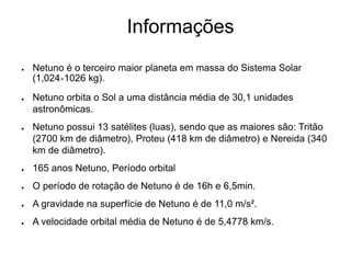 Netuno é o terceiro maior planeta do Sistema Solar e orbita o Sol a uma distância média de 30 unidades astronômicas. Netuno possui 13 luas, sendo as maiores Tritão, Proteu e Nereida. O período orbital de Netuno é de 165 anos e sua gravidade superficial é de 11 m/s2.