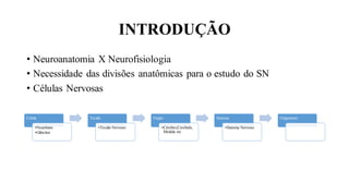O documento apresenta uma introdução à neuroanatomia, descrevendo as divisões do sistema nervoso central em cérebro, cerebelo, tronco encefálico e medula espinhal. Detalha as principais estruturas e funções do lobos cerebrais, diencéfalo, telencéfalo e tronco encefálico.