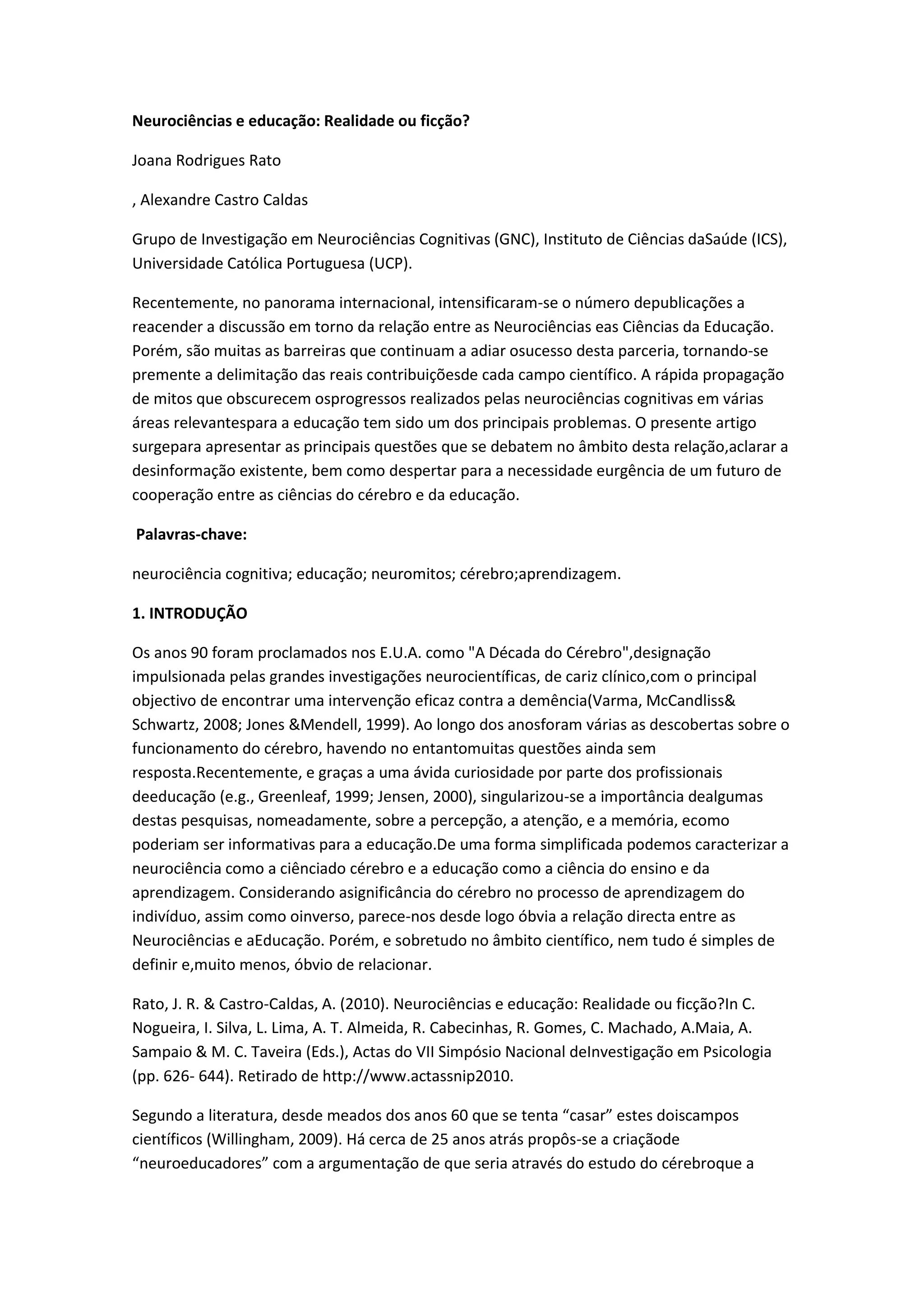 1. O documento discute a relação entre neurociência e educação, destacando os principais desafios e mitos que obscurecem os progressos das neurociências cognitivas relevantes para a educação.