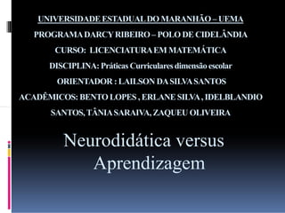 O documento discute a neurodidática e a aprendizagem, explicando como o cérebro aprende através da formação de redes neurais e sinapses. Ele também descreve testes de percepção realizados para entender como diferentes áreas cerebrais processam informações sensoriais e sua importância para o aprendizado. Por fim, conclui que professores devem considerar as capacidades e fraquezas individuais de cada criança.