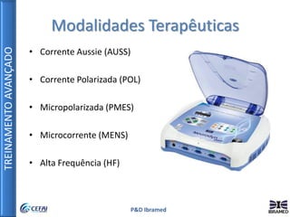 O documento descreve diferentes modalidades terapêuticas utilizando correntes elétricas como a Corrente Aussie, Corrente Polarizada e Micropolarizada. Detalha os parâmetros, mecanismos de ação e técnicas de aplicação de cada modalidade para tratamentos corporais e faciais, incluindo fortalecimento muscular, drenagem linfática, tratamento de celulite, estrias e flacidez.