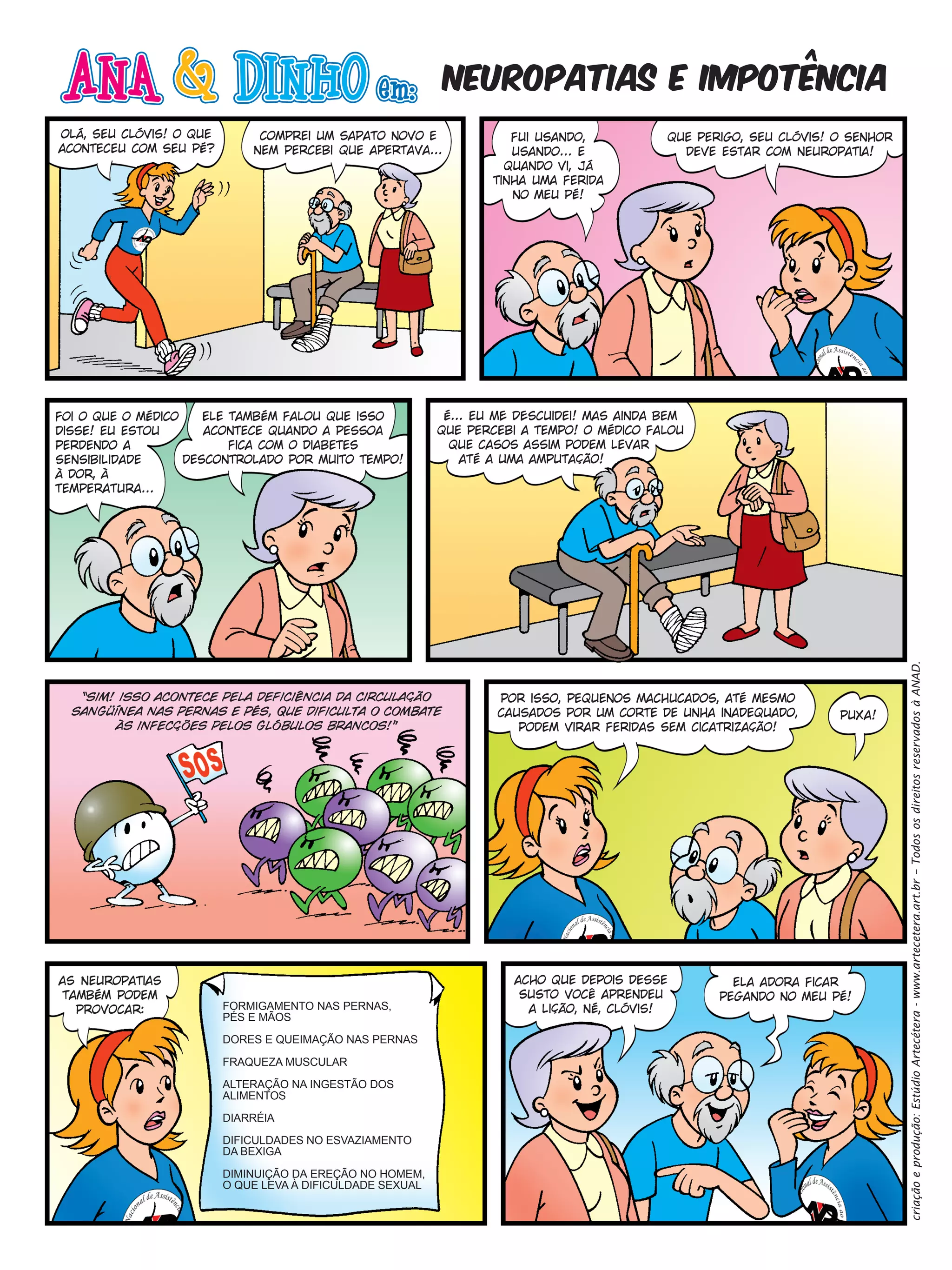O documento discute as neuropatias e suas consequências, incluindo impotência. O paciente teve uma ferida no pé que não cicatrizou devido à perda de sensibilidade causada pelo diabetes descontrolado por muito tempo, levando a uma neuropatia. As neuropatias também podem causar formigamento, dores, fraqueza muscular e outros sintomas.