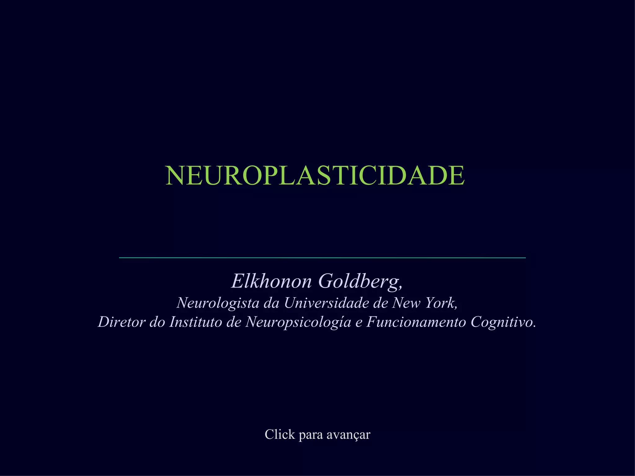 O documento discute a neuroplasticidade, o conceito de que o cérebro pode se regenerar e moldar mediante a atividade mental ao longo da vida. Estudos demonstraram que áreas cerebrais de taxistas, músicos e bilíngues são mais desenvolvidas devido ao uso frequente. Manter uma atividade mental intensa pode proteger a saúde cerebral e é fator de proteção contra demência na velhice.