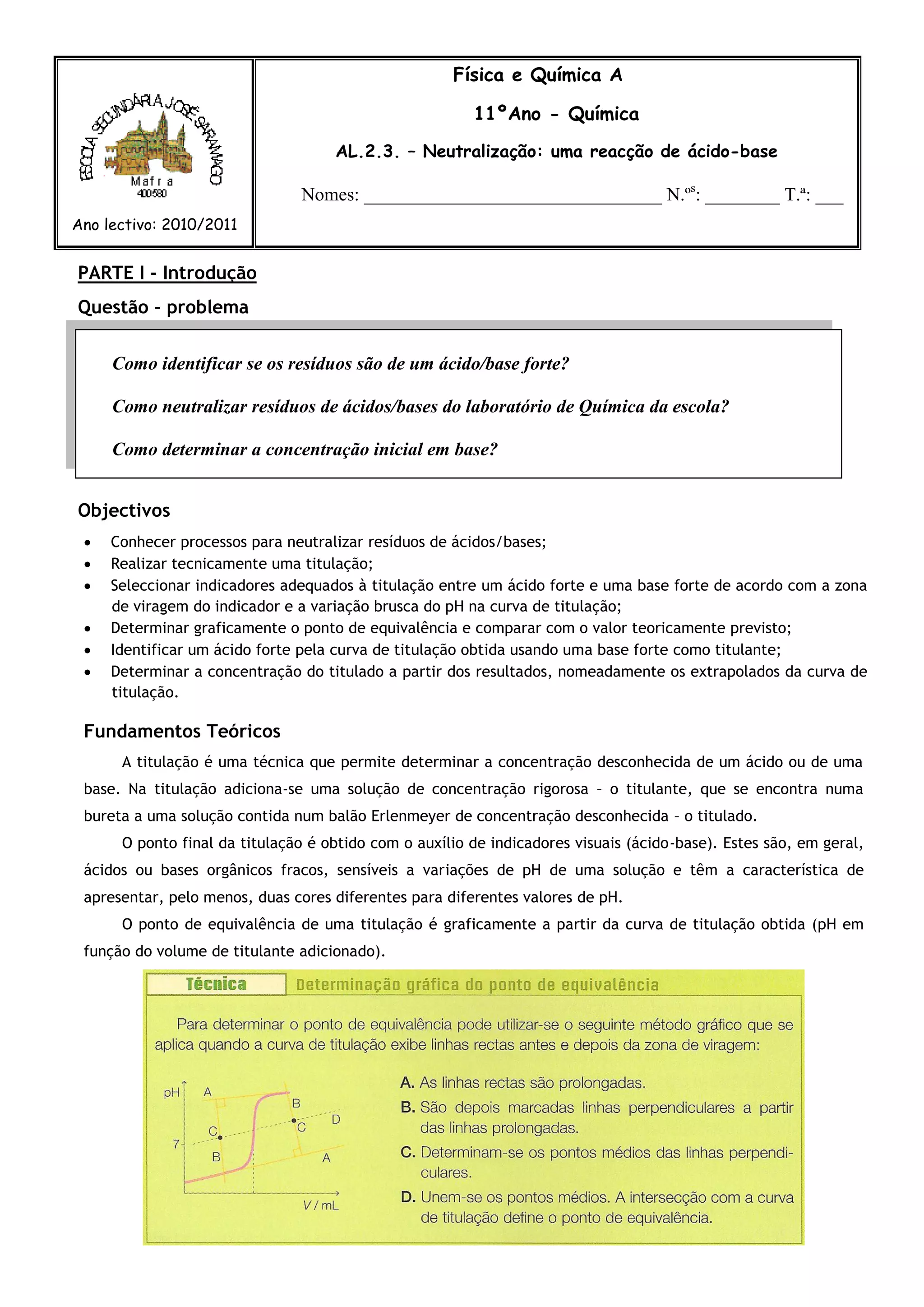 Este documento descreve um experimento de química sobre neutralização entre um ácido forte e uma base forte. O objetivo é determinar a concentração de uma solução de ácido clorídrico desconhecida através de titulações e traçar a curva de titulação. O procedimento envolve titular amostras da solução de HCl com uma solução padrão de NaOH e calcular a concentração de HCl usando a equação da reação de neutralização.