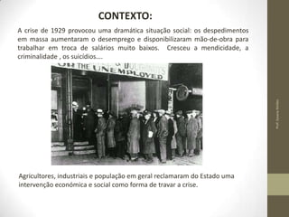A Grande Depressão de 1929 levou a um aumento do desemprego e da pobreza nos EUA. Quando Franklin Roosevelt foi eleito presidente em 1933, ele implementou o New Deal, um programa de intervenção estatal na economia através de medidas como regulamentação industrial, ajuda agrícola e criação de empregos públicos, com o objetivo de equilibrar a produção e o consumo e reduzir o desemprego. As consequências do New Deal incluíram uma queda na taxa de desemprego e um aumento na produção, consumo, pre