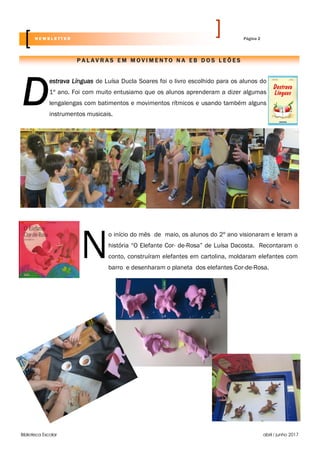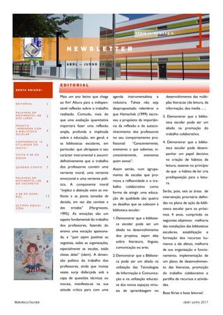 O documento descreve o plano de ação da biblioteca escolar para os próximos 4 anos, que inclui seis áreas prioritárias: melhoria das instalações, recursos humanos, organização, literacias, trabalho colaborativo e partilha de recursos. O objetivo é promover o desenvolvimento das literacias, trabalho colaborativo e uso da biblioteca como aliada educacional.