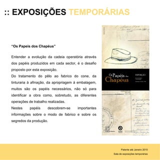 O documento descreve as exposições, oficinas e eventos agendados para Outubro no Museu da Chapelaria de S. João da Madeira, incluindo uma exposição temporária sobre a evolução da produção de chapéus, oficinas para famílias e idosos, e eventos especiais como o Halloween.