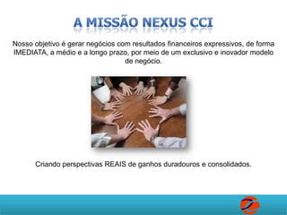 A Nexus CCI é uma empresa que oferece um modelo de negócios inovador com potencial para gerar renda imediata e a longo prazo, permitindo que os associados ganhem através de compras em parceiros credenciados, com um investimento inicial baixo. O sistema baseia-se em um marketing multinível onde os participantes são incentivados a convidar outras pessoas, aumentando seus ganhos a cada mês conforme a rede cresce. Além disso, a formação de associados máster proporciona acesso a um painel avançado, aumentando ainda mais o potencial de lucro e a infraestrutura do negócio.
