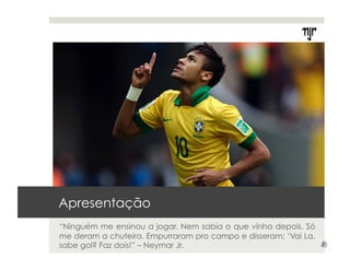 O documento analisa a marca Neymar Jr., destacando sua trajetória no futebol e a construção de sua imagem como ícone global. Neymar é reconhecido por sua habilidade em campo, carisma e sucesso na publicidade, valendo mais que várias seleções de futebol. A marca é jovem e ligada ao estilo de vida, com associações a moda e cultura pop, além de ser vista como um símbolo do futebol brasileiro.
