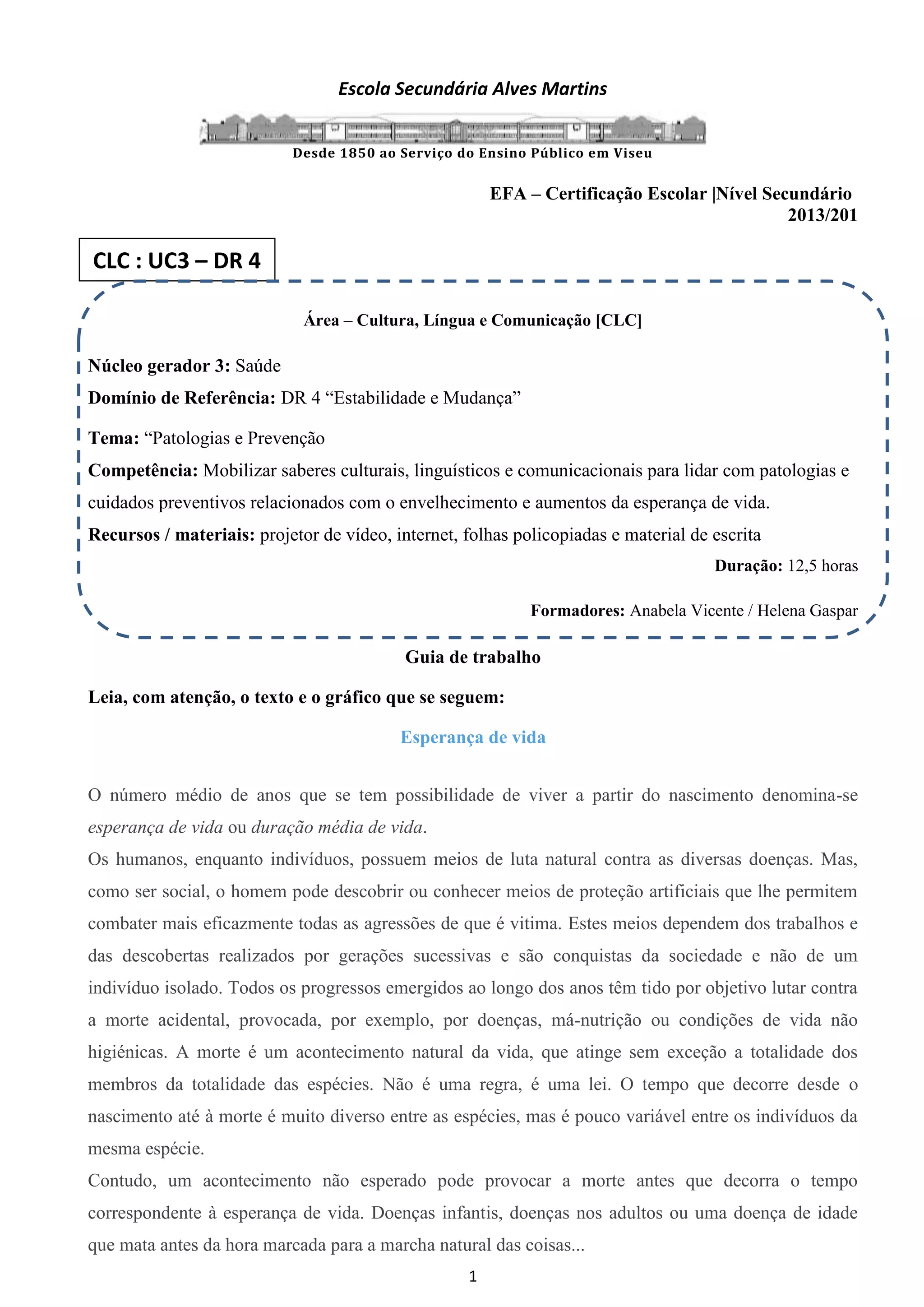 O documento discute o aumento da esperança de vida em diferentes países ao longo do tempo, devido a fatores como menores taxas de mortalidade infantil e melhorias nos cuidados de saúde e condições de vida. A esperança de vida é maior nos países desenvolvidos do que nos subdesenvolvidos. Os alunos devem debater as causas e consequências deste aumento e redigir uma notícia sobre uma visita de estudo relacionada a saúde e prevenção.