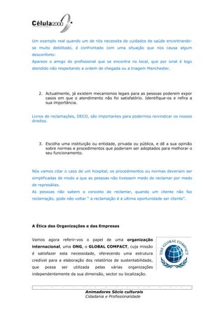 O documento discute a importância de valores como convicção e firmeza ética para o desenvolvimento institucional. Ele propõe uma reflexão sobre valores e posturas em contextos organizacionais e apresenta o Global Compact, uma iniciativa das Nações Unidas que encoraja empresas a adotarem dez princípios relacionados a direitos humanos, trabalho, meio ambiente e anticorrupção.
