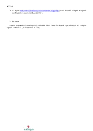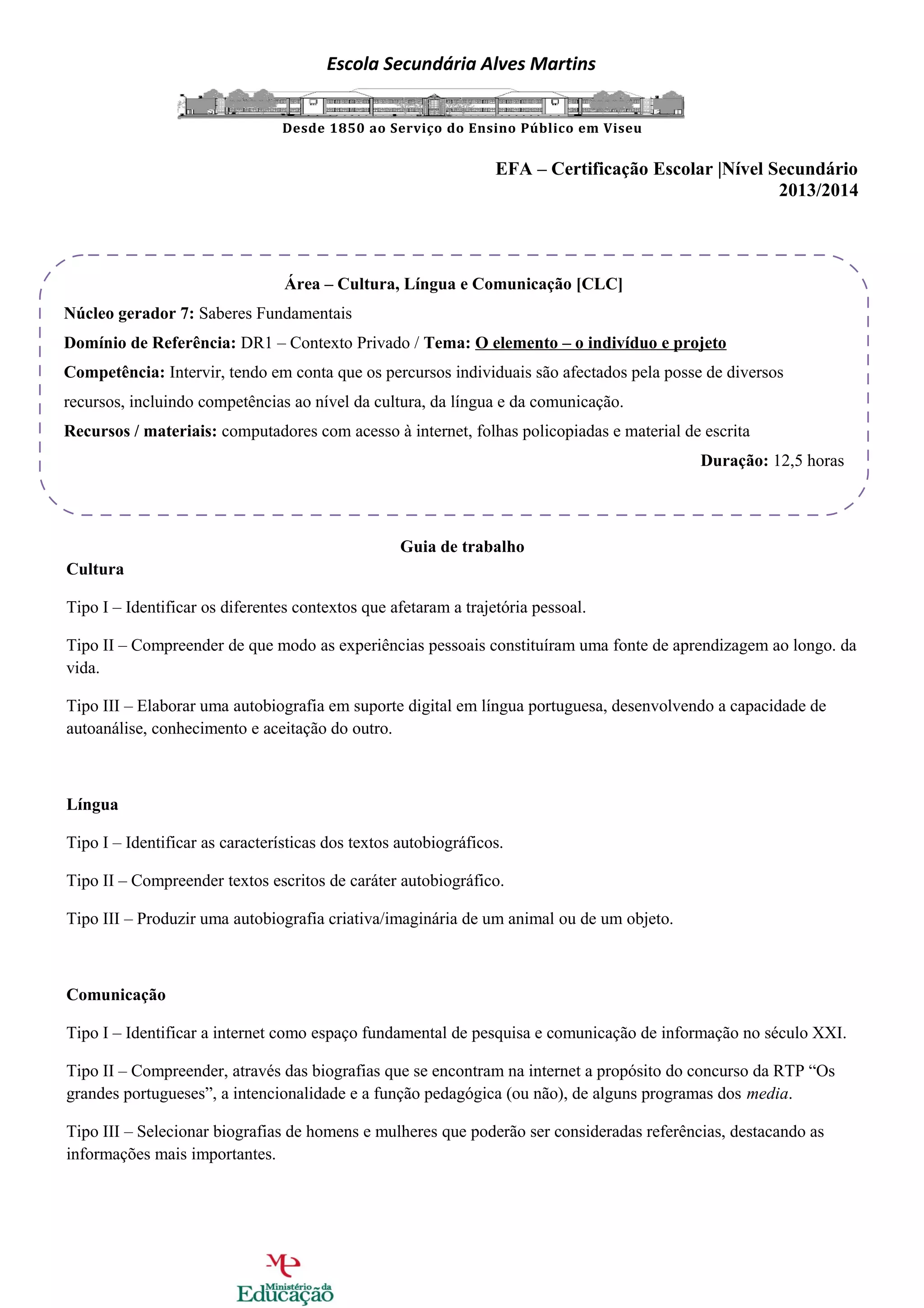 Este documento fornece um guia de trabalho para estudantes do ensino secundário sobre cultura, língua e comunicação. Inclui três tipos de atividades para cada área, como identificar características de textos autobiográficos e produzir uma autobiografia imaginária de um animal. O guia também fornece recursos online para pesquisa e exemplos de autobiografias.