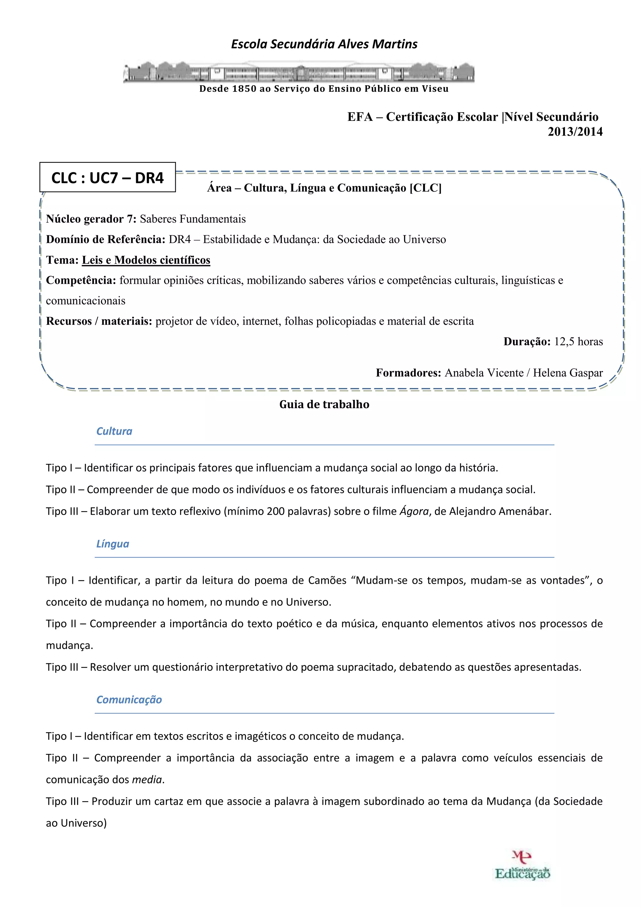Este documento fornece instruções para um projeto de 12,5 horas sobre leis e modelos científicos no âmbito da mudança social. Os alunos irão identificar fatores de mudança social e cultural, analisar um poema sobre mudança e produzir um cartaz associando palavra e imagem ao tema.
