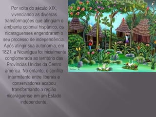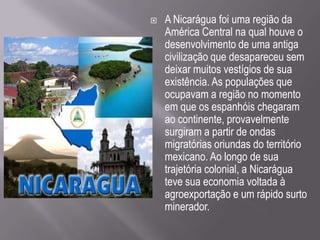 A Nicarágua foi o local de uma antiga civilização pré-colombiana que desapareceu sem deixar muitos vestígios. Quando os espanhóis chegaram, a região era ocupada por povos vindos do México. Durante a colonização, a economia da Nicarágua focou na exportação agrícola e mineração. No século XIX, os liberais nicaraguenses chegaram ao poder propondo modernizar o país, mas os EUA intervieram para controlar setores econômicos estratégicos.