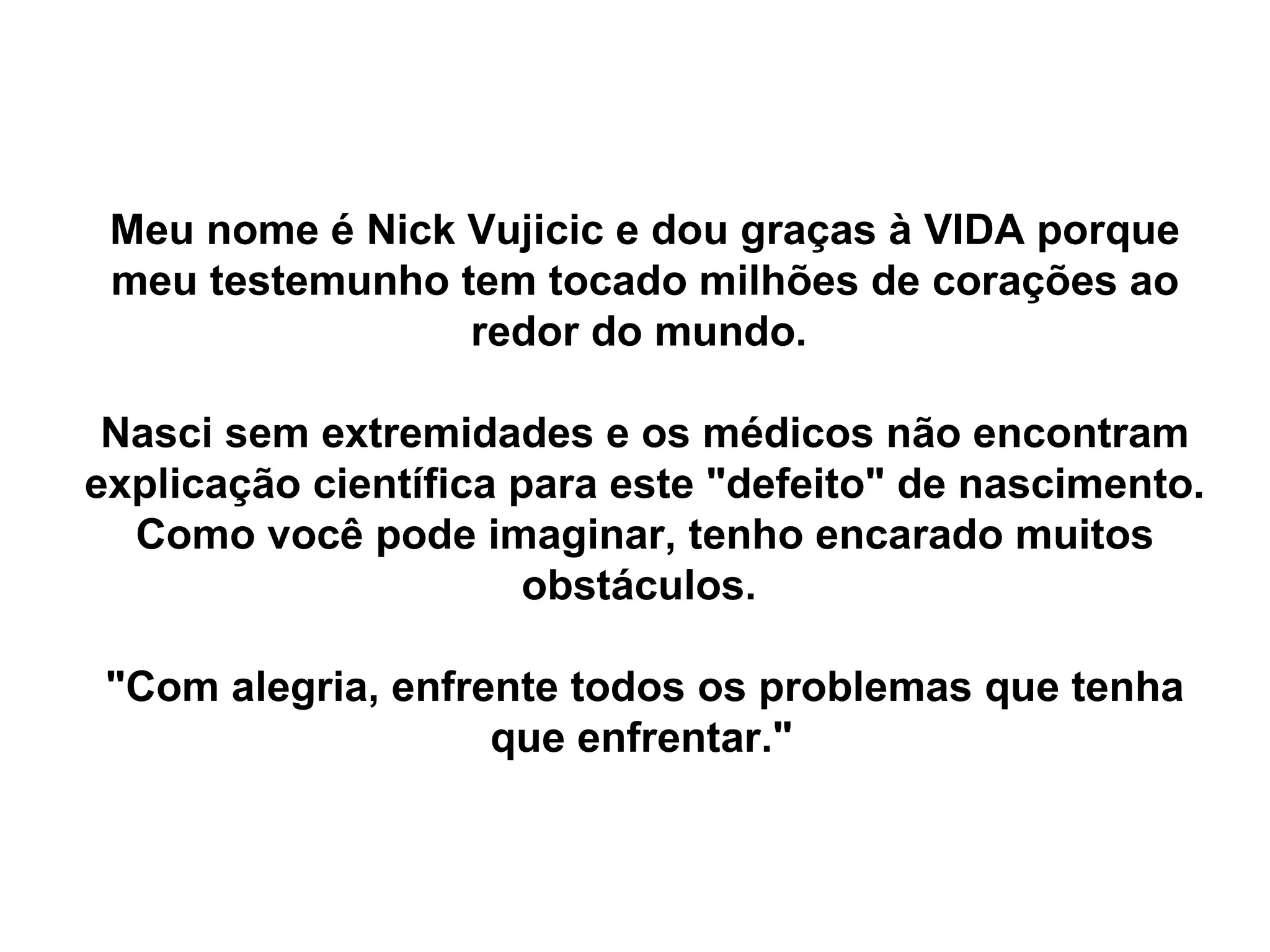 Nick Vujicic nasceu sem membros na Austrália. Apesar das dificuldades iniciais e do bullying na escola, ele desenvolveu autoestima e agora viaja o mundo como palestrante motivacional, compartilhando sua história de superação. Seus sonhos incluem escrever livros e inspirar outros.