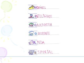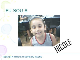 Este documento apresenta informações pessoais sobre uma menina chamada Nicole e sua família para uma atividade escolar do 1o ano. Ele fornece detalhes sobre a aparência de Nicole, sua família, hobbies, comidas e frutas preferidas.