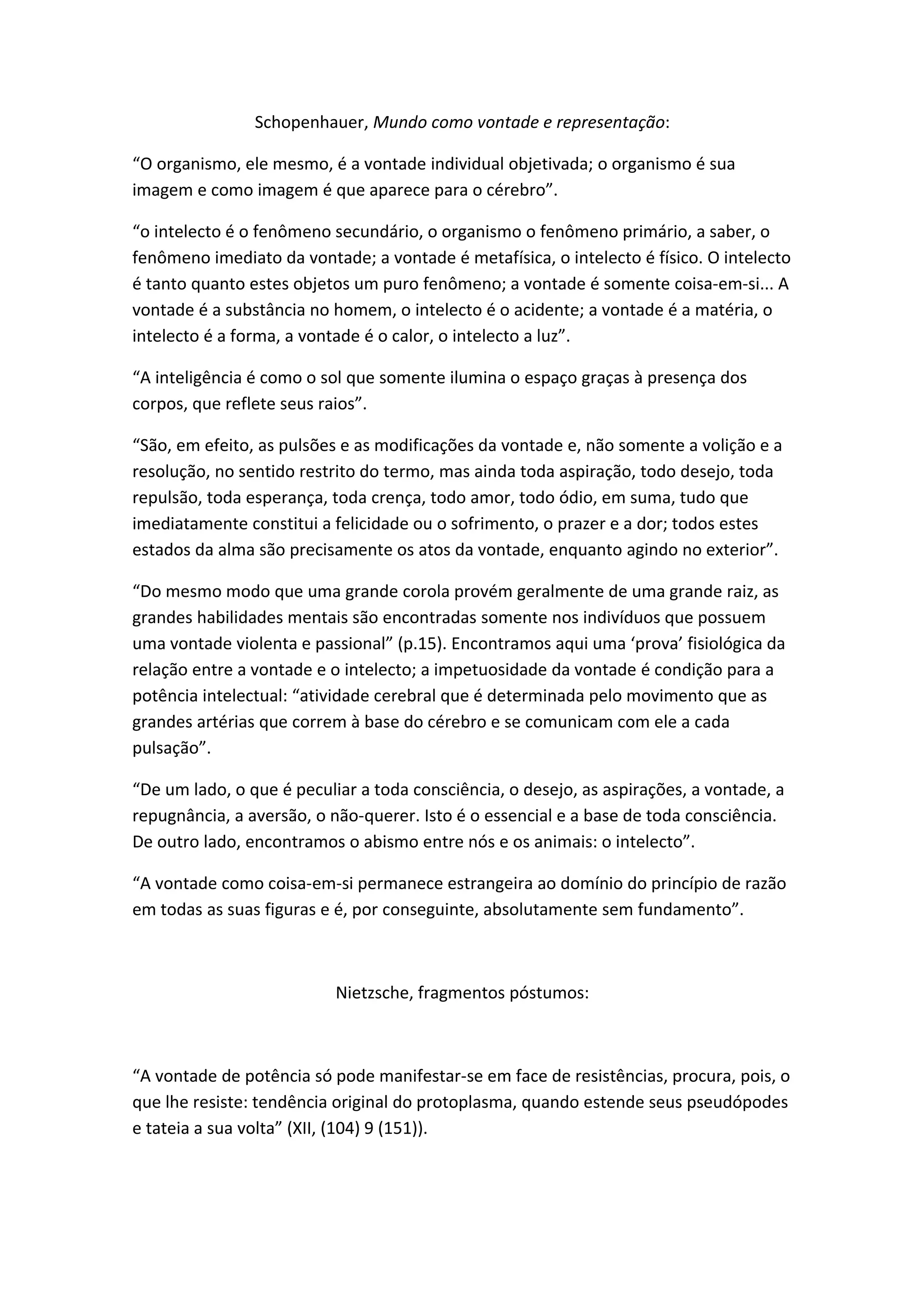 Os textos discutem a relação entre vontade, intelecto e consciência. Schopenhauer vê a vontade como primordial e o intelecto como secundário, enquanto Nietzsche critica a ideia de uma vontade ou eu como coisa-em-si e vê o eu como uma ficção criada pelo pensamento para impor ordem ao caos da multiplicidade humana. Ambos destacam a importância da vontade na determinação da atividade intelectual.