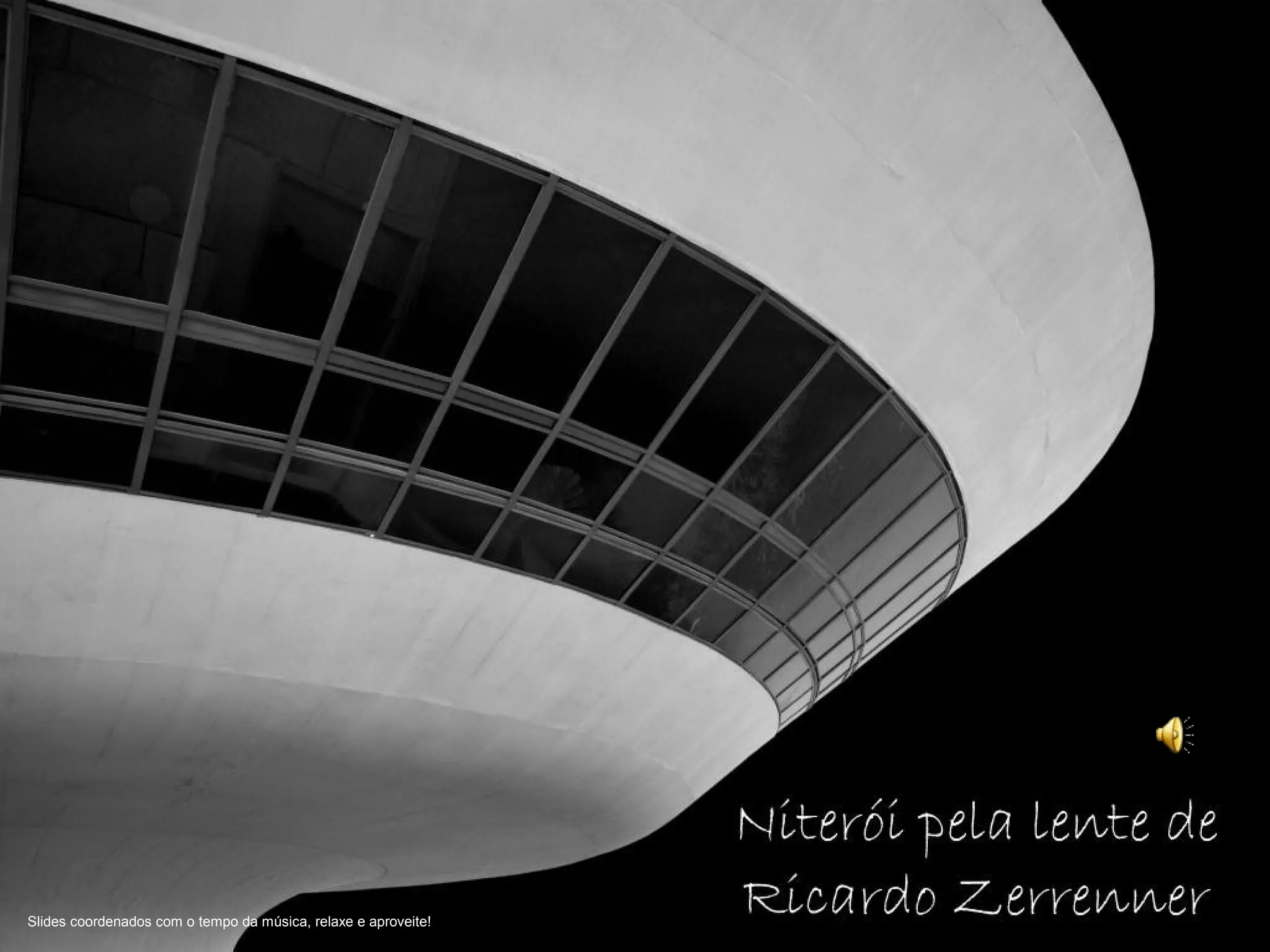 O documento apresenta slides coordenados com música mostrando diferentes praias e locais da região de Niterói, como Praia de Icaraí, Praia de São Francisco, Morro do Morcego em Jurujuba, Praia de Charitas, Praia de Camboinhas, Praia de Itaipú, Itaipuaçú, Praia de Piratininga, Lagoa de Piratininga, Praia do Sossego, Fortaleza de Santa Cruz e Forte do Gragoatá.