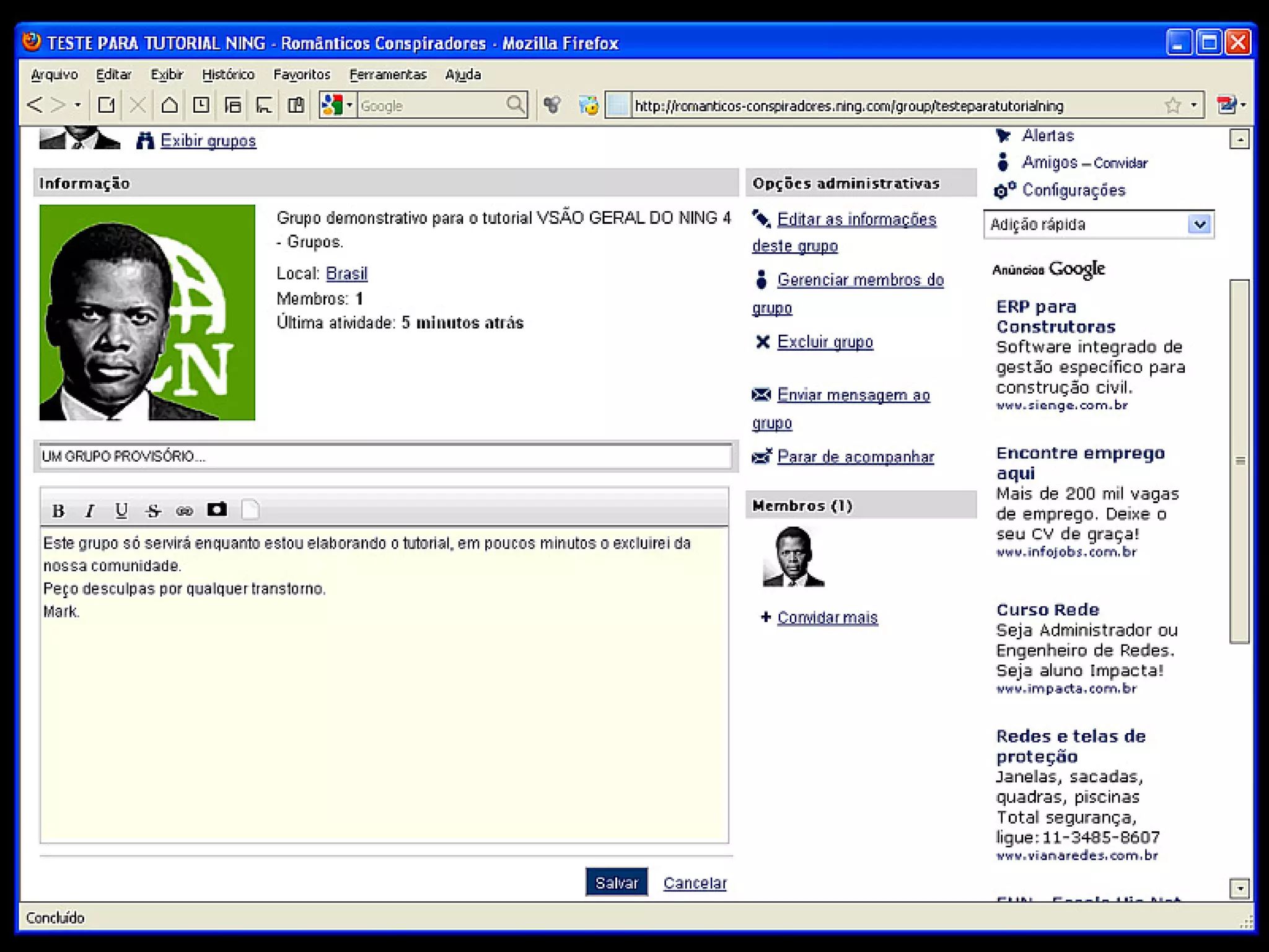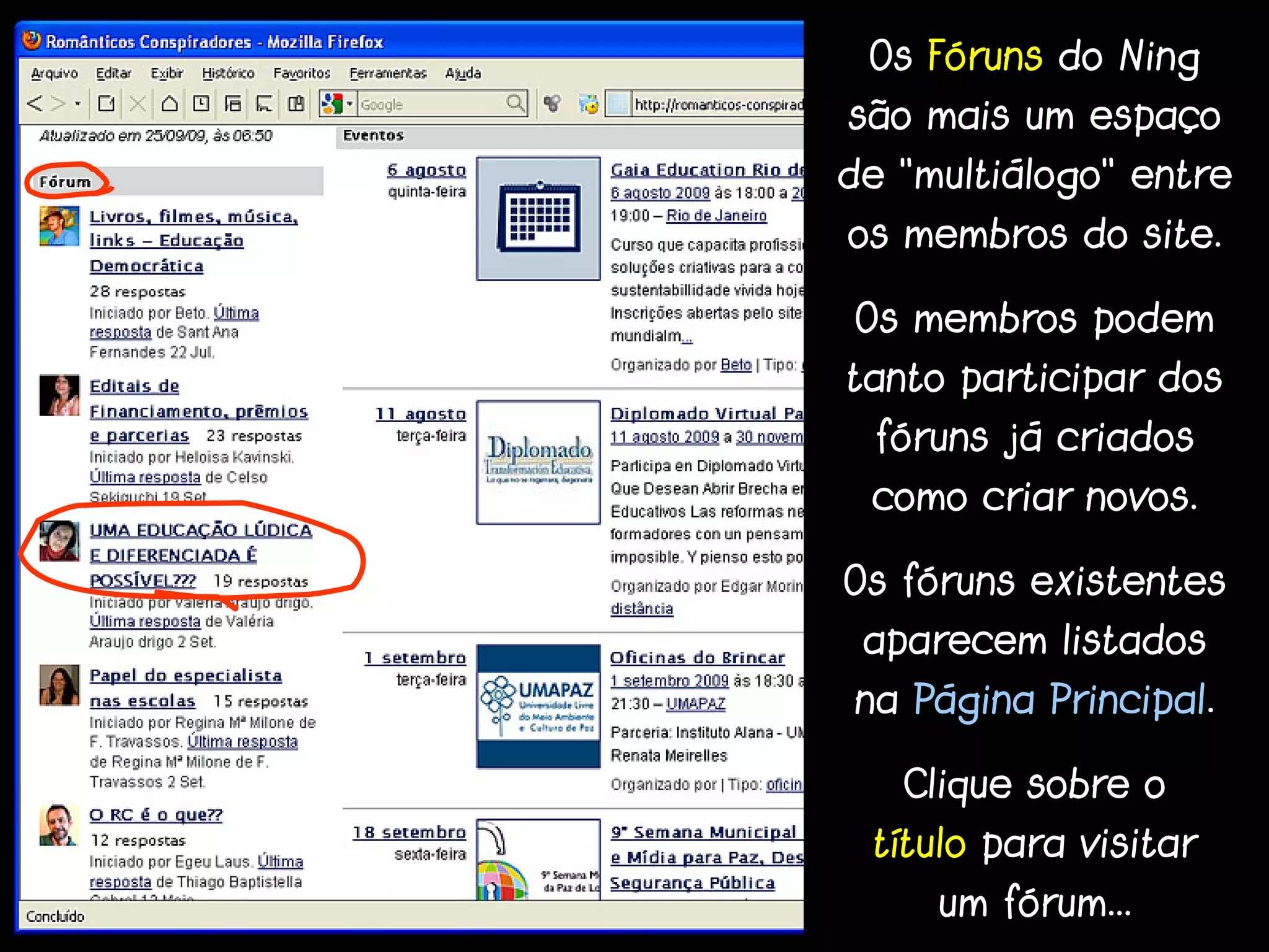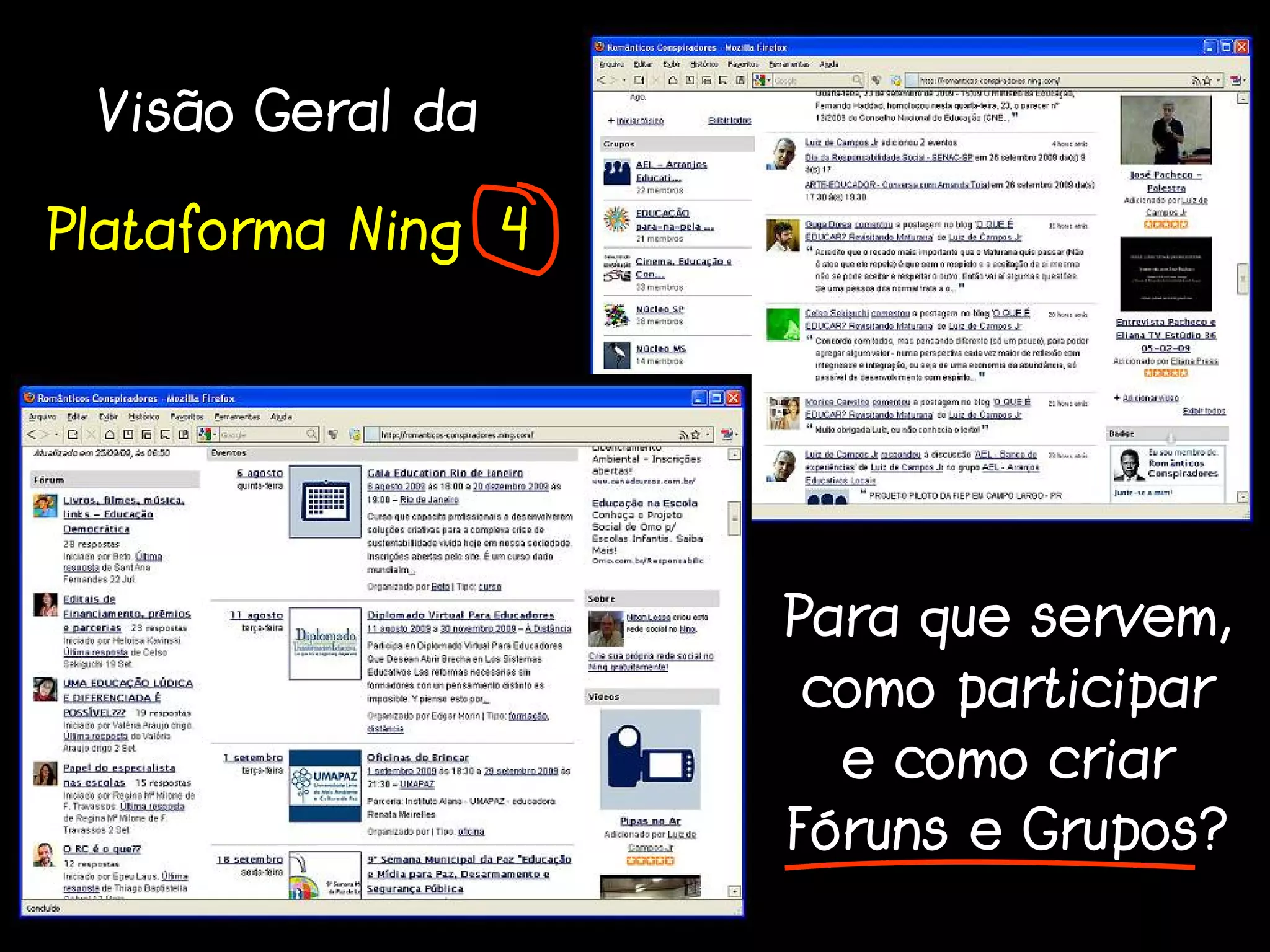 Os Fóruns e Grupos da plataforma Ning permitem a interação entre membros através de discussões e compartilhamento de conteúdo. Os membros podem participar de Fóruns e Grupos existentes ou criar seus próprios. A criação de novos Fóruns e Grupos é um processo simples envolvendo escolha de título, texto introdutório e configuração de permissões.
