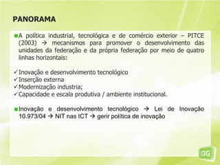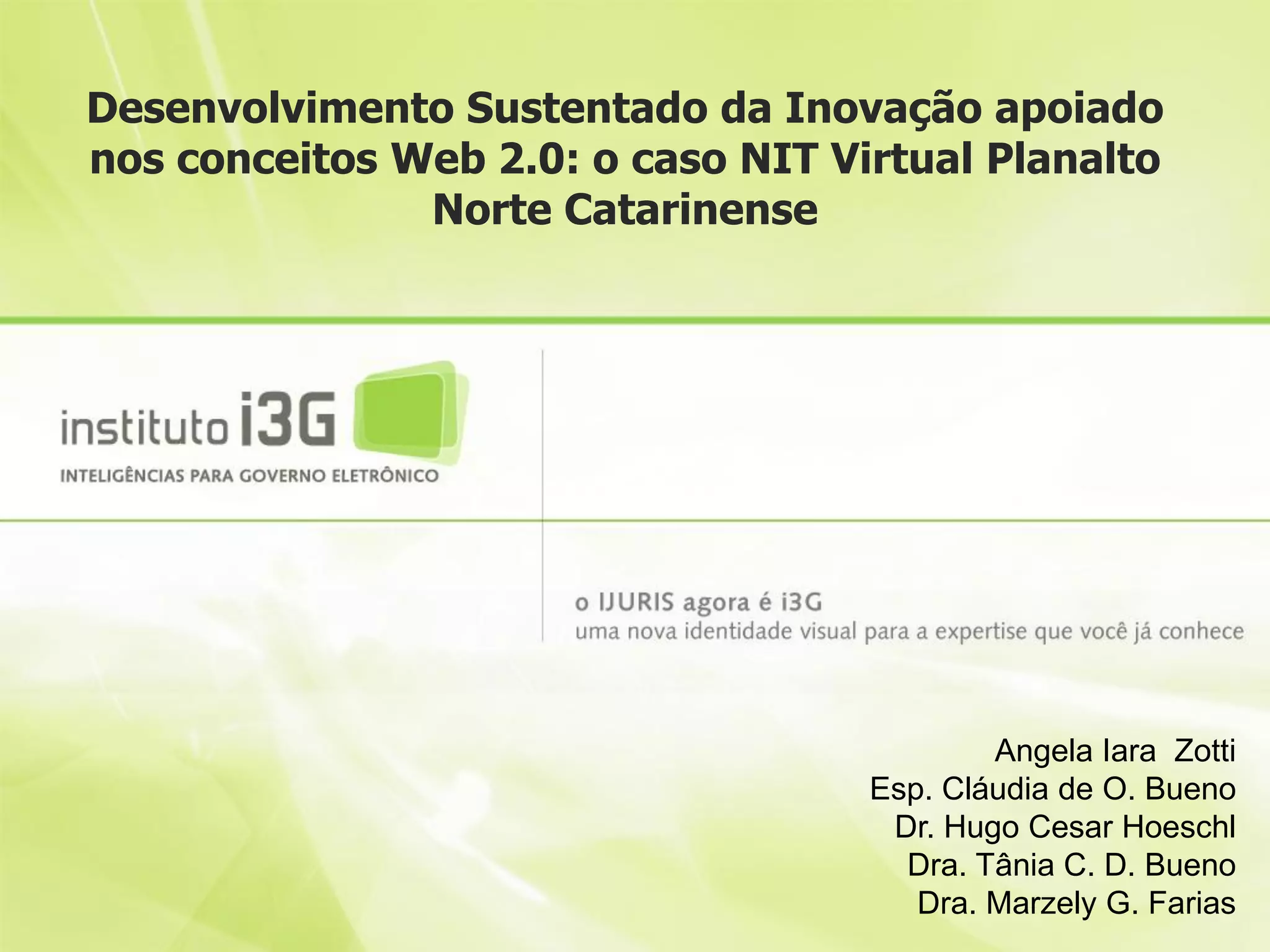 O documento discute o NIT Virtual Planalto Norte Catarinense, um projeto que usa ferramentas da Web 2.0 para apoiar a inovação sustentável em um arranjo produtivo local de móveis. O NIT Virtual interliga empresas, universidades e governo para disseminar conhecimento, apoiar o desenvolvimento de estratégias inovadoras e agregar valor aos produtos. Ferramentas como blogs, redes sociais e ambientes online ajudam a compartilhar informações e promover a inovação de forma colaborativa.