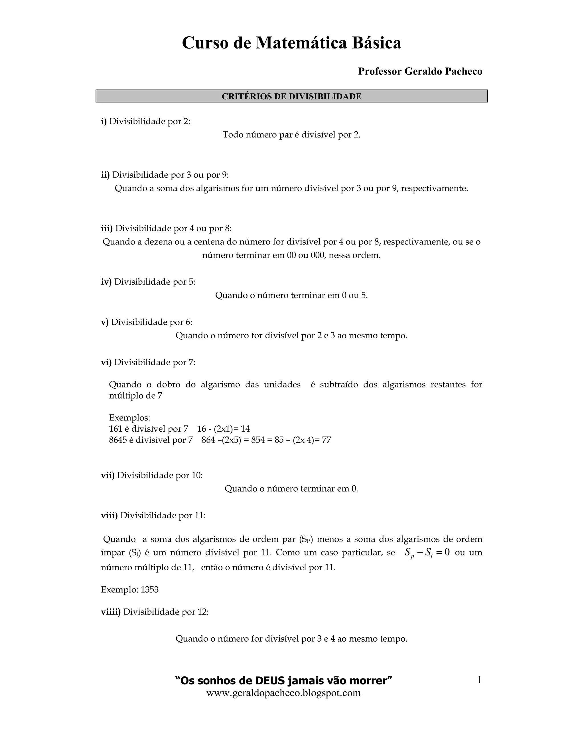 i) O documento apresenta os critérios de divisibilidade por diferentes números. ii) Inclui a decomposição de números em fatores primos e a determinação da quantidade de divisores de um número. iii) Aborda o máximo divisor comum e o mínimo múltiplo comum entre números.