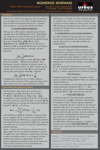O documento discute o conceito de números normais em expansão decimal, introduzido por Borel em 1909, e sua definição em várias bases. Apresenta também resultados importantes sobre a normalidade de números, incluindo exemplos clássicos como a constante de Champernowne e a constante de Copeland-Erdős. Além disso, menciona questões em aberto, como a normalidade de constantes notáveis como e e π.