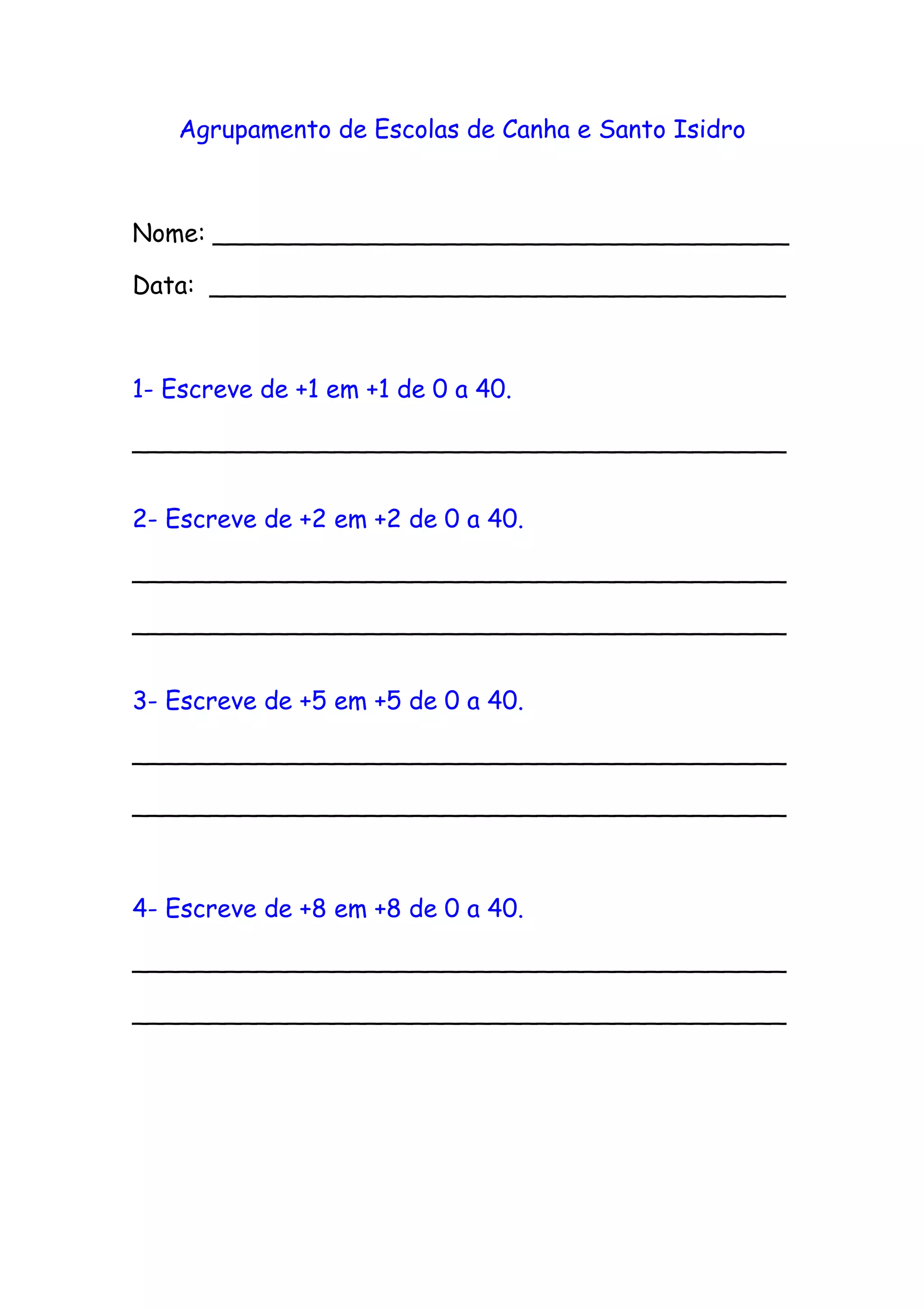 O documento é um teste matemático com várias questões: a primeira pede para escrever de 1 em 1 de 0 a 40, a segunda de 2 em 2 no mesmo intervalo, a terceira de 5 em 5 e a quarta de 8 em 8. A quinta questão pede para completar algumas operações matemáticas com somas de números entre 10 e 40.