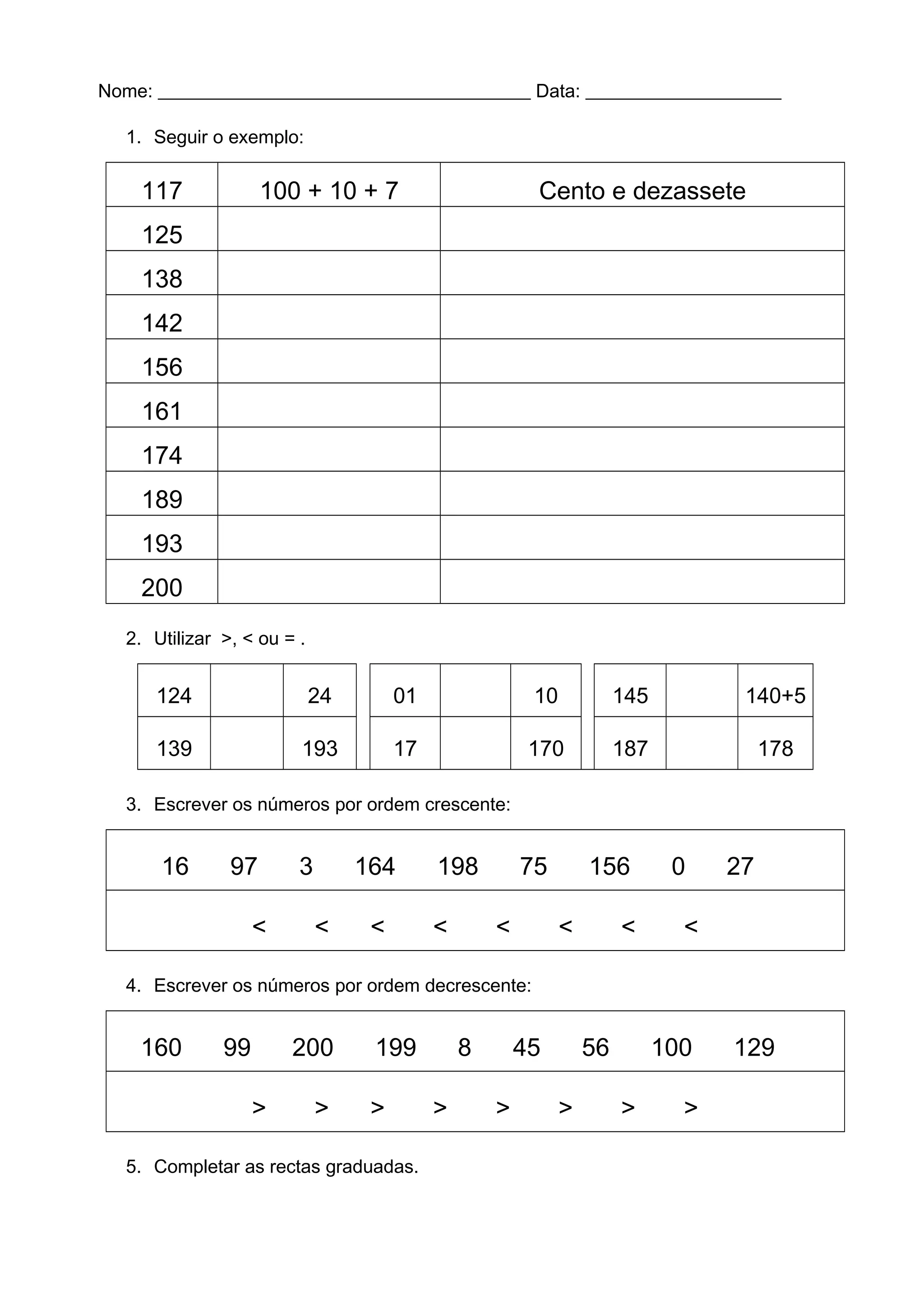 Este documento contém exercícios de matemática envolvendo números e operações como adição, comparação e ordenação. Os estudantes são instruídos a seguir exemplos de adição, usar símbolos de comparação entre números, escrever números em ordem crescente e decrescente, e preencher graduações com números específicos.