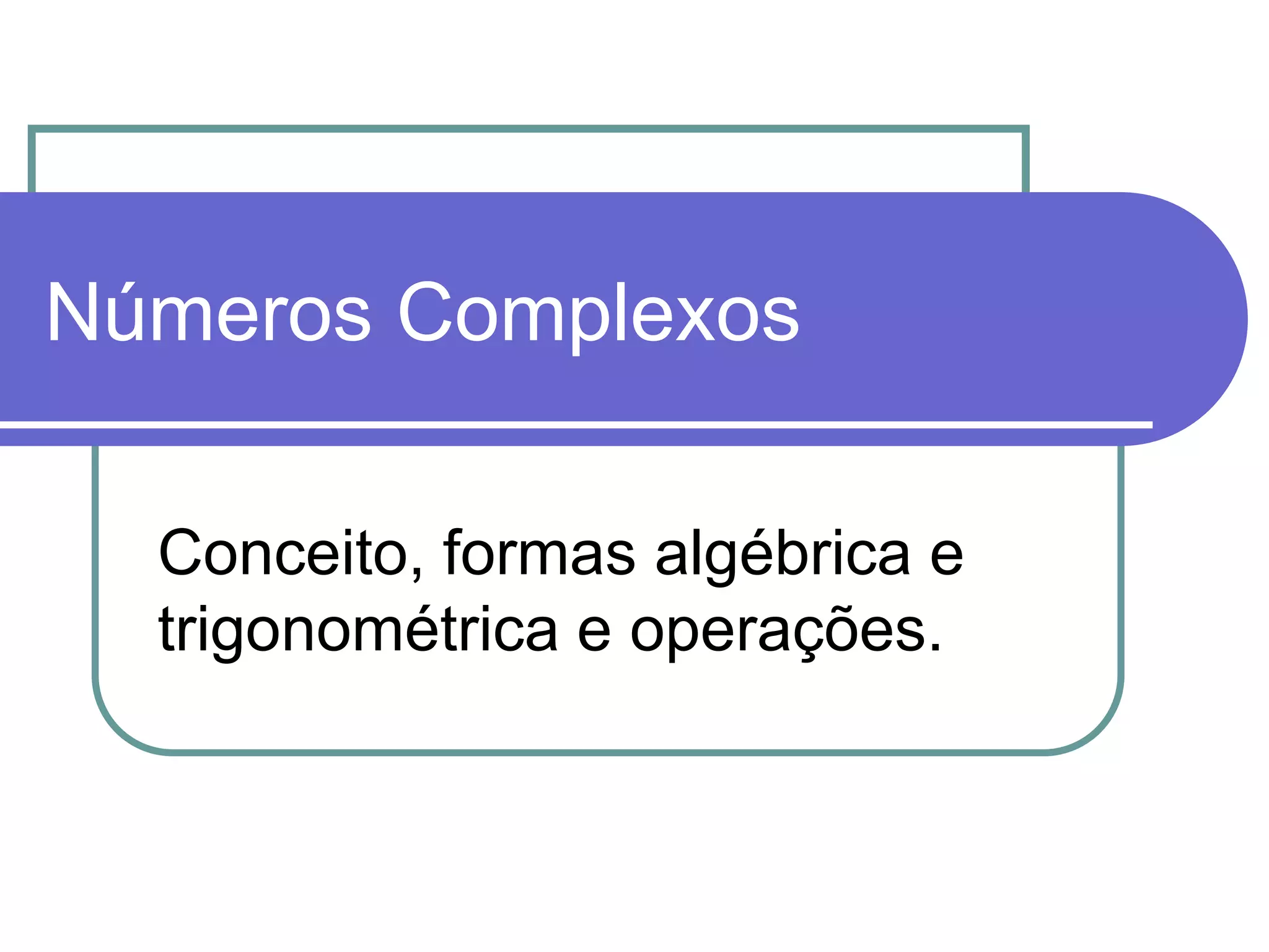 O documento apresenta os conceitos básicos dos números complexos, incluindo sua forma algébrica e trigonométrica e operações com eles. É introduzido o número i que elevado ao quadrado é igual a -1, permitindo a resolução de equações como x2 + 1 = 0 e definindo o conjunto dos números complexos C.
