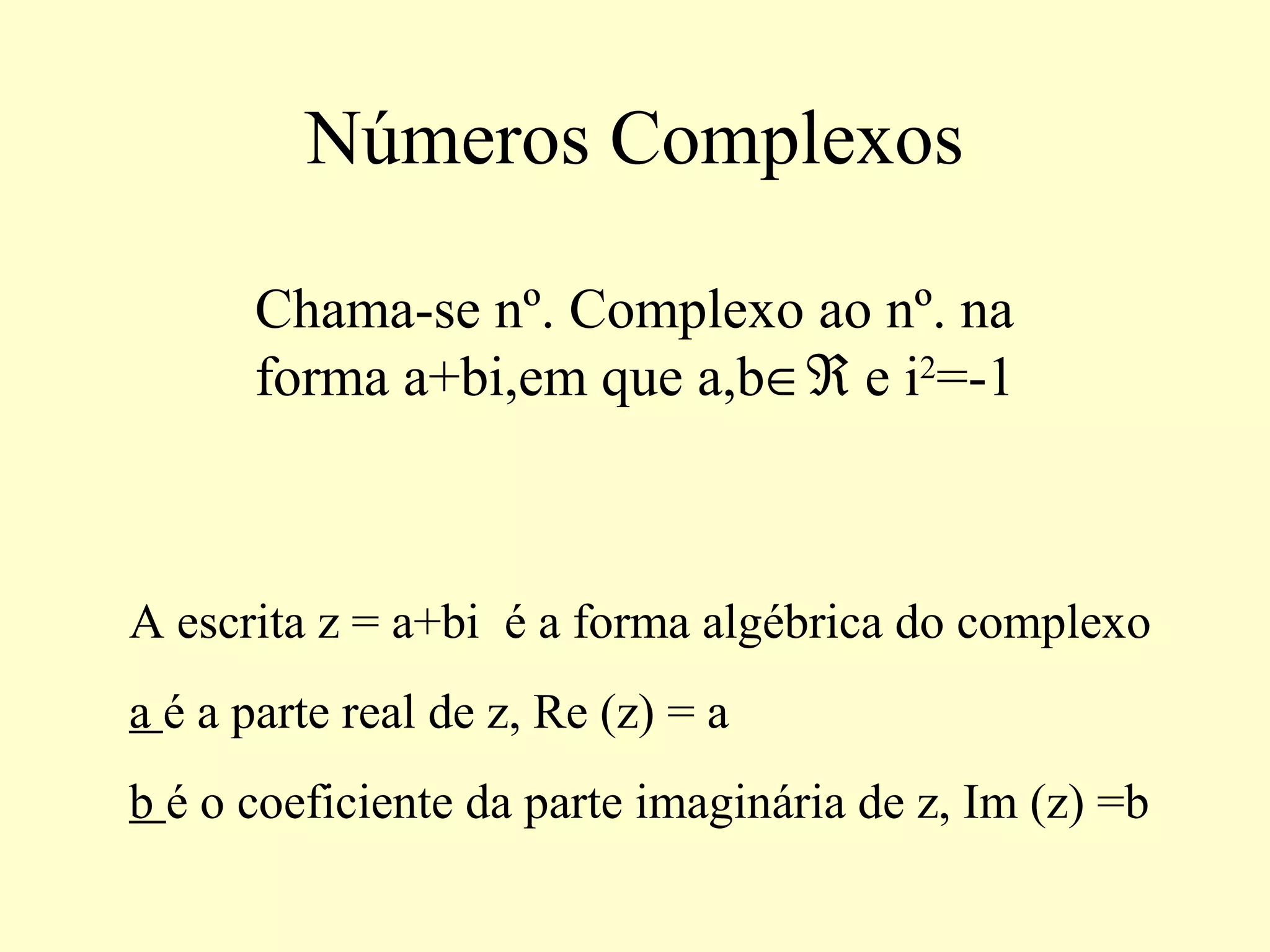 1) O documento descreve a representação e operações com números complexos, incluindo sua forma algébrica como a + bi, representação geométrica no plano complexo, módulo, argumento e formas trigonométrica e algébrica.