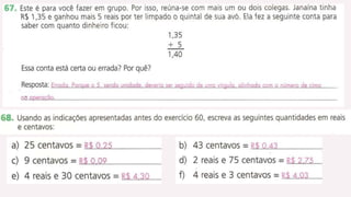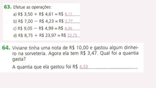 Números decimais têm parte inteira e decimal separadas por vírgula. Ao somar ou subtrair números decimais, aplica-se a regra de "vírgula abaixo de vírgula" e iguala-se a quantidade de casas decimais acrescentando zeros à direita quando necessário.