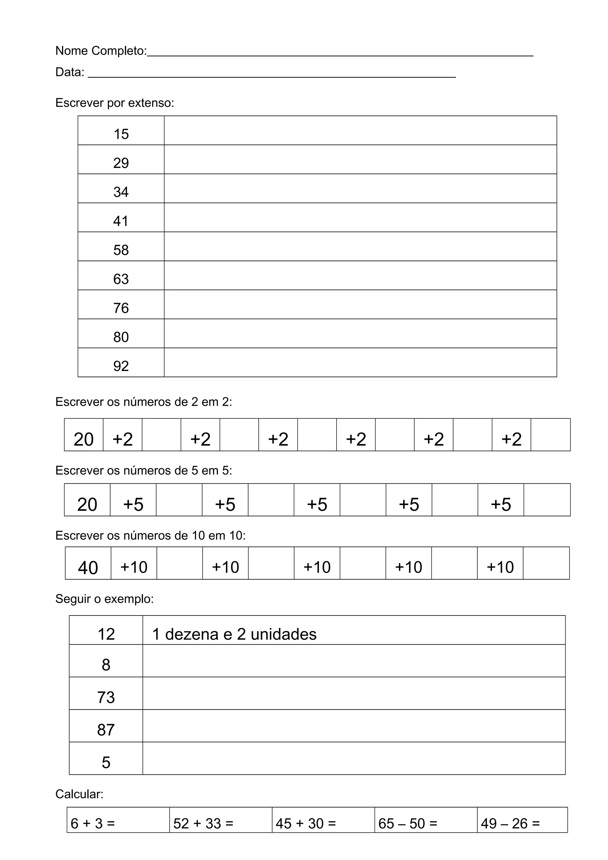 O documento pede para escrever números por extenso, de 2 em 2 e de 5 em 5, além de dividir palavras em sílabas e realizar cálculos matemáticos.