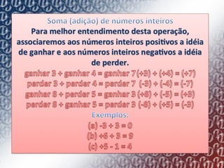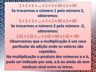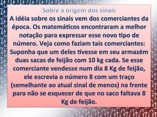 1) O documento descreve como os matemáticos antigos começaram a usar sinais como "+" e "-" para representar ganhos e perdas de quantidades.