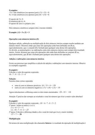 1) O documento apresenta os conceitos básicos de operações com números inteiros, incluindo adição, subtração, multiplicação e divisão.