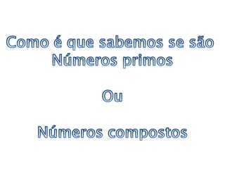 O documento define números primos como aqueles que só podem ser divididos por 1 e por si mesmos, diferente dos números compostos que podem ser divididos por mais de dois números. Ele lista alguns exemplos de números primos de 1 a 7 e um número composto, 4, para ilustrar a diferença entre esses dois tipos de números.