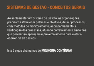 O documento discute a importância da identificação de não conformidades e ações corretivas e preventivas em sistemas de gestão. A melhora contínua requer monitoramento de processos e produtos, análise de problemas e implementação de soluções. Produtos não conformes devem ser identificados, segregados e corrigidos ou descartados, enquanto ações corretivas e preventivas atacam as causas raízes dos problemas.