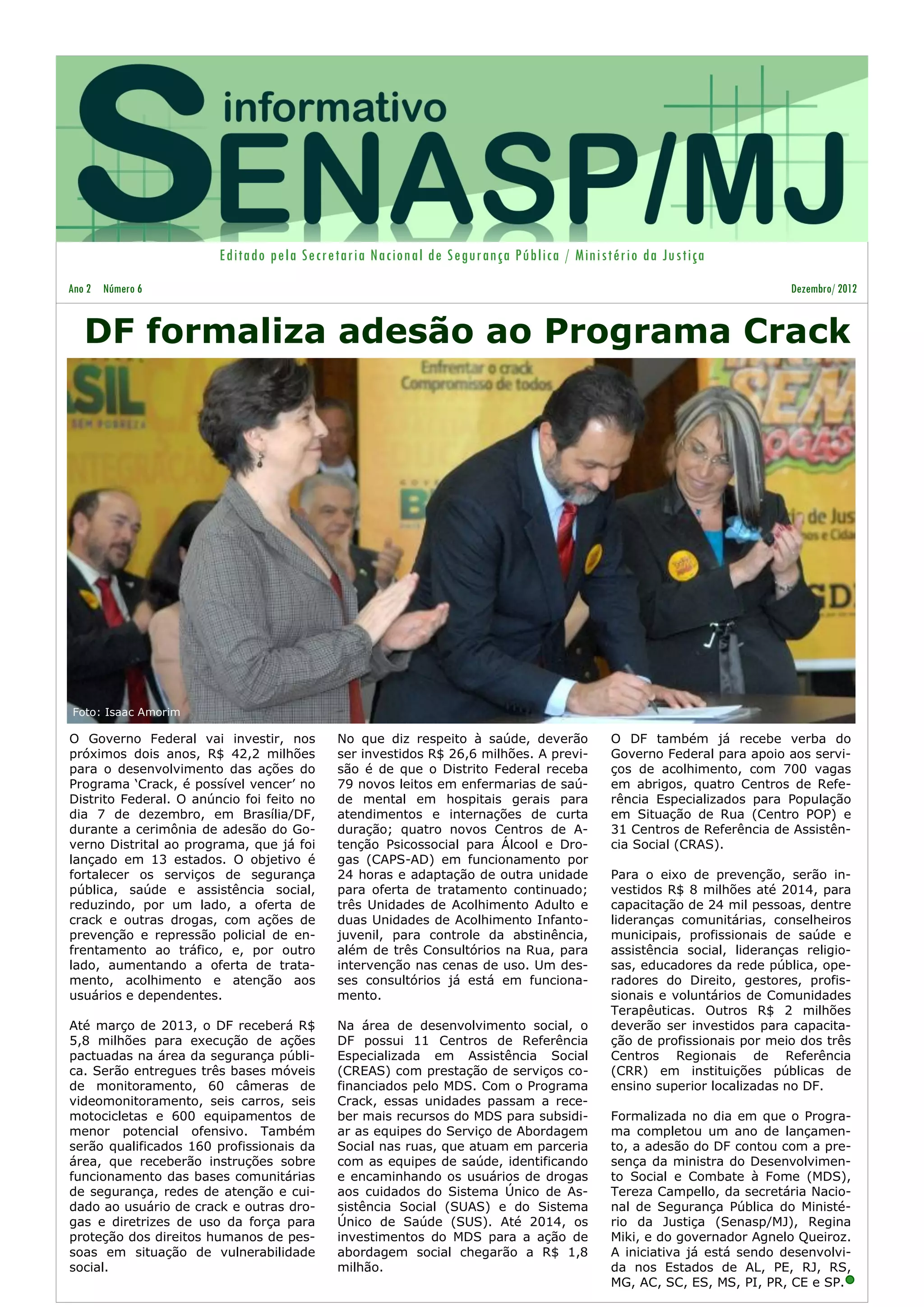 O documento resume a adesão do Distrito Federal ao Programa Crack, é possível vencer. O governo federal investirá R$42,2 milhões nos próximos dois anos para fortalecer a segurança pública, saúde e assistência social no DF. Os recursos serão destinados a ações como ampliação de leitos para dependentes químicos e capacitação de profissionais.