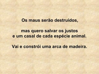 Deus ordena a Noé que construa uma arca para salvar os animais e as pessoas justas de um dilúvio que inundará Portugal. Noé enfrenta muitas dificuldades burocráticas para obter licenças e permissões necessárias para a construção, como da Câmara Municipal, Bombeiros, Instituto Florestal, entre outros. Quando finalmente termina a arca, ela é colocada sob penhora pelas Finanças. Deus decide não destruir Portugal, reconhecendo que a burocracia já o havia destruído antes.