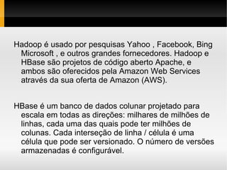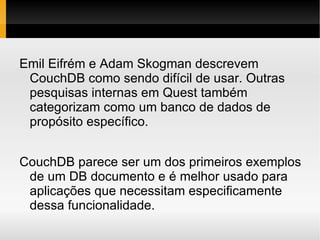 1) O documento apresenta conceitos sobre bancos de dados NoSQL, incluindo taxonomia, características como escalabilidade horizontal e replicação, e exemplos como Cassandra, HBase e Voldemort.