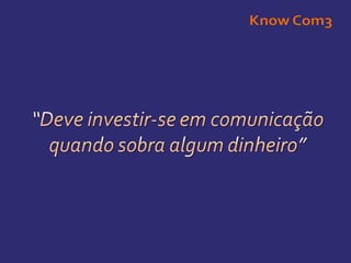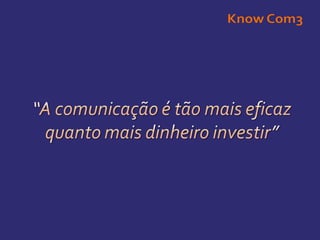 Na KnowCom3 acreditamos que todos os negócios podem crescer e que a comunicação faz parte desse crescimento. Tudo numa organização comunica. E nós vamos ajudá-lo! Know Com3