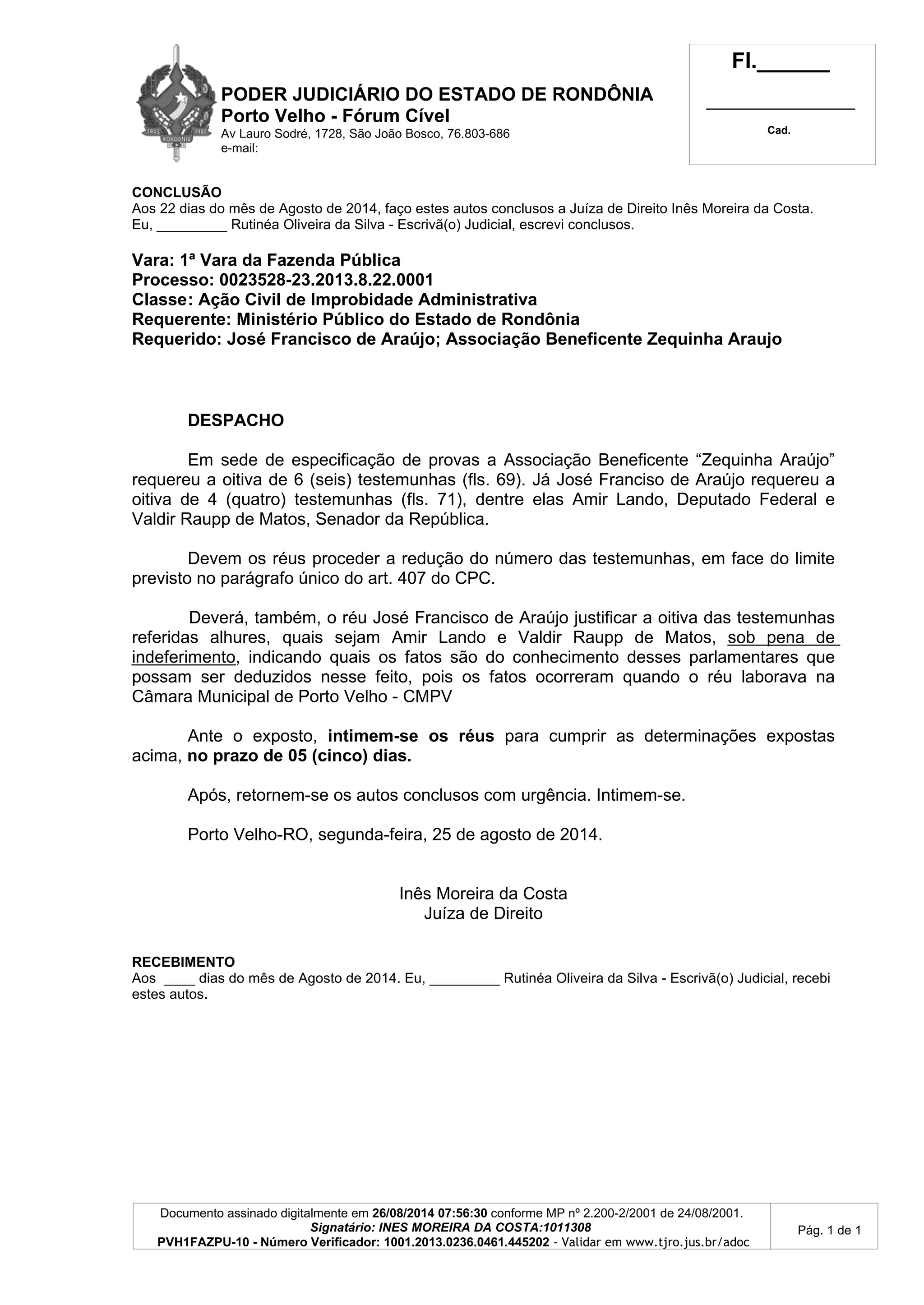 O documento trata de um processo judicial sobre improbidade administrativa. A juíza determina que os réus reduzam o número de testemunhas e que um dos réus justifique a oitiva de dois parlamentares como testemunhas, indicando quais fatos desse processo são do conhecimento deles.