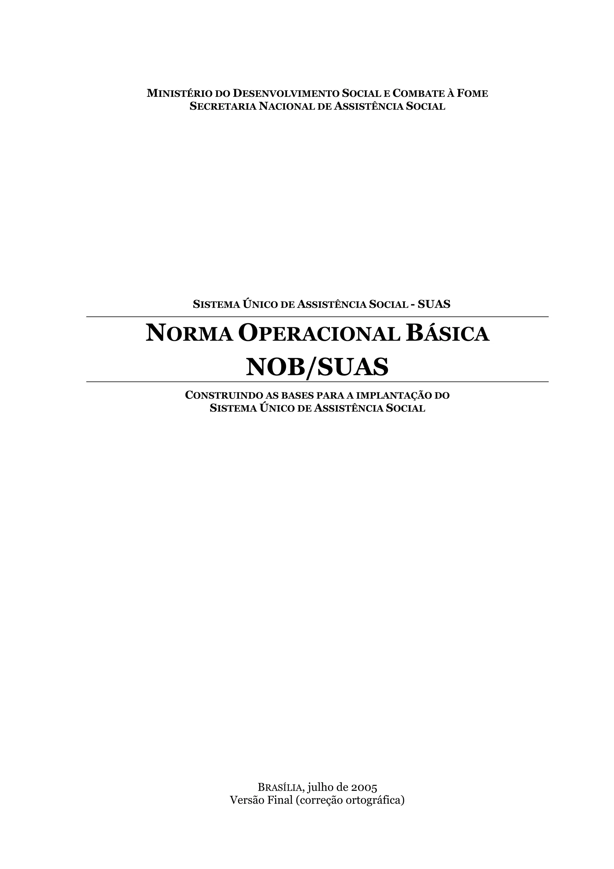 Este documento apresenta a Norma Operacional Básica do Sistema Único de Assistência Social (SUAS) no Brasil. Ele define os princípios, tipos e níveis de gestão do SUAS entre a União, estados e municípios. Também estabelece os instrumentos de gestão, como o Plano de Assistência Social e o orçamento, e as instâncias de articulação, pactuação e deliberação entre os entes federados e a sociedade civil. Por fim, trata das regras de financiamento, transferência de recursos