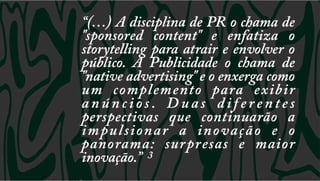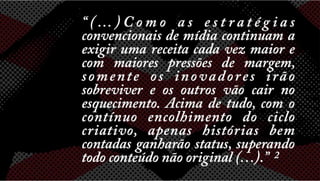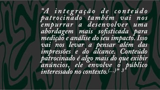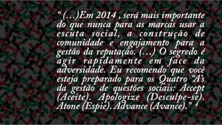 O documento faz previsões sobre as tendências de marketing de conteúdo para 2014. Apresenta que: 1) as estratégias de conteúdo patrocinado terão maior destinação de verbas e credibilidade; 2) o marketing baseado em conteúdo criado de forma ética prosperará, enquanto abordagens não éticas serão criticadas; 3) respostas sociais serão cada vez mais importantes para as marcas se conectarem com o público.