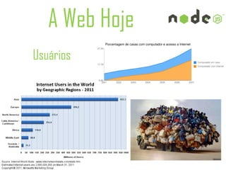 O documento discute as limitações da arquitetura web síncrona atual que usa threads bloqueantes para lidar com requisições, e apresenta o Node.js como uma alternativa que utiliza um modelo de programação orientado a eventos e um loop de eventos para atender a muitas requisições de forma assíncrona e não bloqueante, permitindo escalar verticalmente sem precisar de muitas threads.
