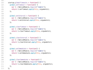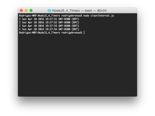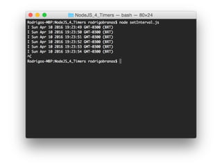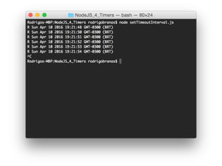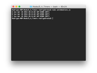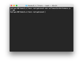 O documento aborda o uso de timers em JavaScript, explicando como agendar a execução de funções com setTimeout e setInterval. Também discute como cancelar timers e a diferença entre setTimeout e setImmediate em termos de performance. Exemplos de código ilustram as funcionalidades mencionadas.